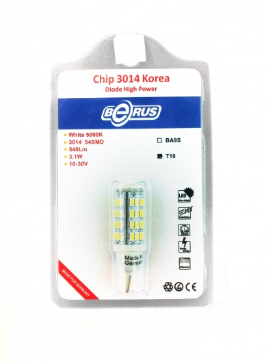 Светодиодная лампа T10 3.1W предназначена для установки в задние габариты. Она намного ярче обычных галогеновых ламп, отлично освещает дорогу даже ночью и в дождливую, туманную погоду. Цвет свечения со временем не изменяется. Служит такая лампа очень долго, при этом потребляет незначительное количество энергии.