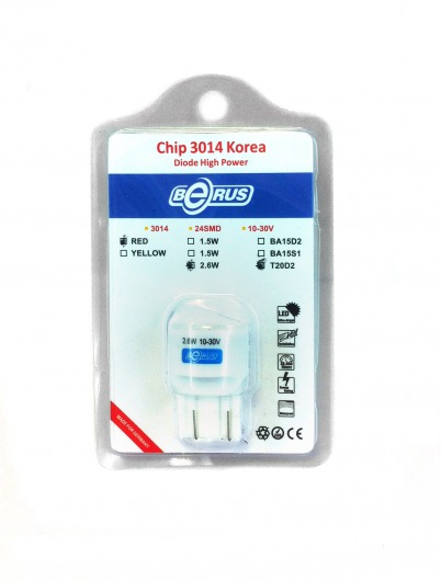 Светодиодная лампа T20 2.6W предназначена для установки в противотуманные фары и указатели поворотов. Она намного ярче обычных галогеновых ламп, отлично освещает дорогу даже в самую непроглядную темноту и сильный ливень. Цвет свечения со временем не изменяется. Служит такая лампа очень долго, при этом потребляет незначительное количество энергии.
