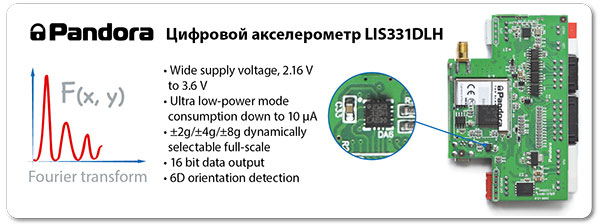 В Pandora 5000New применен совершенный 3-х координатный акселерометр c цифровым интерфейсом LIS331DLH от компании STMicroelectronics, который используется в топовых современных смартфонах, таких как Iphone 5. Кроме того, применены совершенные математические алгоритмы, используемые в геодезических приборах и навигации быстродвижущихся объектов в космонавтике и современной авиации.