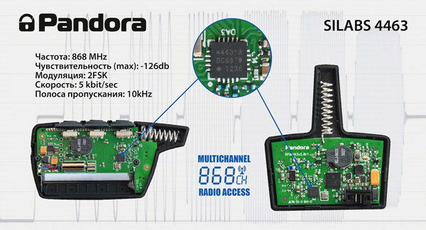 В системе применен абсолютно новый радиотракт основой для которого послужил новейший интегральный трансивер SI4463. Новый радиотракт использует радиодиапазон 868MHz с 12 независимыми каналами, c очень узкой шириной полосы пропускания (не более 10KHz). Чем уже полоса пропускания, тем выше реальная помехозащищенность и дальность связи. Дальность канала управления системы 5000New почти вдвое превосходит дальность предыдущей Pandora 5000. Дальность канала оповещения увеличилась еще больше. При этом мощность работы передатчиков RF-модуля и брелока не превышают нескольких десятков милливатт!