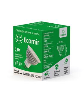 Светодиодная лампа Ecomir GU5.3 5W эквивалентна галогеновой лампе мощностью 35 Вт с цоколем MR16. Потребляемая мощность – всего 5 Вт, цветовая температура – 3000 К (это желтый свет). Световой поток — 350 лм. Напряжение — 220 В. Матовый рассеиватель. Угол освещения > 90°.