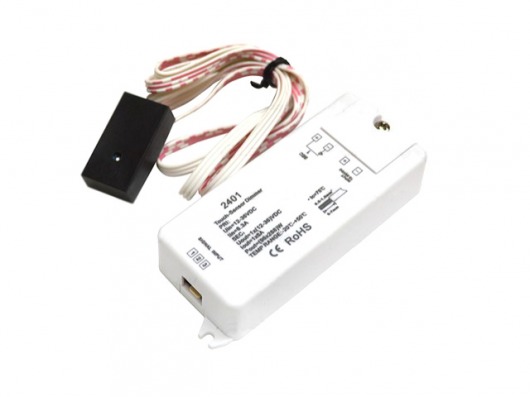 Диммер с контактным выключателем IR-2401 поможет вам без труда включить или выключить диммер. Вам всего лишь нужно дотронуться до сенсорного индикатора  — и диммер заработает! При этом вы можете легко выбирать яркость из доступных 128 уровней, просто удерживая руку на диммере. В комплект входит датчик и блок управления.