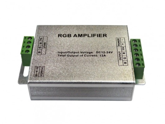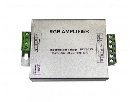 RGB усилитель LP-24A в металлическом корпусе позволит "разгрузить" RGB контроллер. Т.е. если мощность необходимого метража ленты превышает допустимую мощность контроллера, то к нему можно подключить усилитель. Таким образом, вы можете подсоединить до 20 метров дополнительной светодиодной ленты.