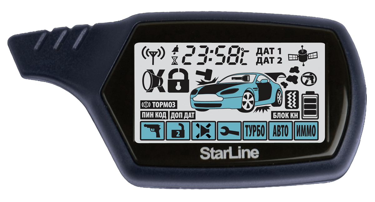 Сигнализация комплектуется удобным брелком с русифицированным ЖК-дисплеем. Максимально возможно увеличен размер ключевых элементов - иконки замка и цифрового индикатора, показывающего текущее время, температуру, функции программирования. Также увеличен размер иконок выбираемых функций. Все тексты на русском языке. Благодаря всему этому, пользоваться брелком очень комфортно и легко.