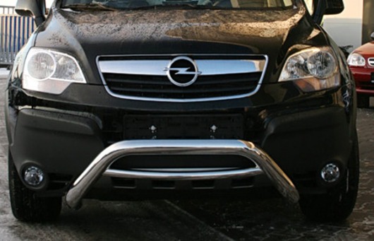 Передняя решетка Opel Antara (кенгурятник) – это защитная дуга на бампер из нержавеющей стали диаметром 76 мм.
