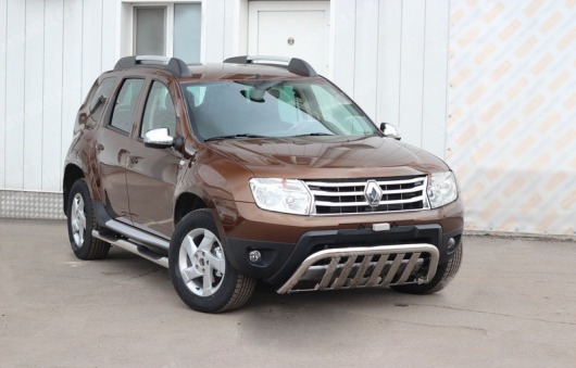 Передняя решетка Renault Duster (кенгурятник) – это защитная дуга с защитой на бампер из нержавеющей стали диаметром 60 мм.