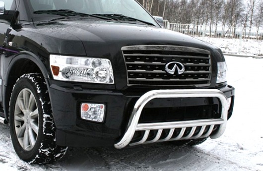Передняя решетка Infiniti QX56 (кенгурятник) – это защитная дуга на бампер из нержавеющей стали диаметром 76 мм.