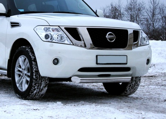 Защита переднего бампера труба предназначена для автомобилей Nissan Patrol от 2010 г.в. Вам не придется подгонять защиту под размеры бампера вашего авто. И с монтажом проблем не возникнет: установка защиты переднего бампера производится в штатные отверстия, а значит, необходимость сверлить кузов отпадает.