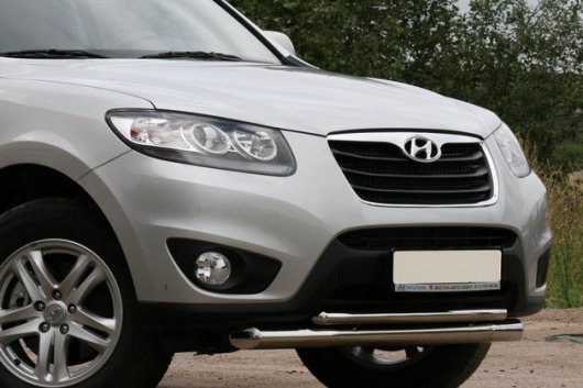 Защита переднего бампера для Hyundai Santa Fe – это двойная труба на бампер из нержавеющей стали диаметром 76/42 мм.