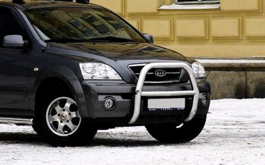 Защитная решетка переднего бампера предназначена для автомобилей Kia Sorento 2002-2006 г.в. Вам не придется подгонять передний кенгурятник под размеры кузова вашего авто. И с монтажом проблем не возникнет: установка кенгурятника Kia Sorento производится в штатные отверстия, а значит, необходимость сверлить кузов отпадает.