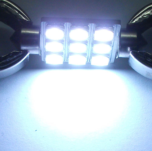 Светодиодная лампа 9 SMD построена на базе 9 сверхярких SMD светодиодов, восемь из которых расположено по окружности лампы, а один - на конце. Лампа предназначена для освещения салона.