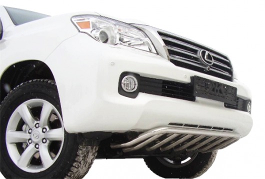 Дуга на бампер Lexus GX460 защищает нижнюю часть переднего бампера автомобиля от различных механических повреждений при мелких ДТП и неудачных парковках, а также незаменима при езде по бездорожью. А кроме этого, нижняя защита переднего бампера на Лексус GX460 смотрится очень стильно и эффектно.