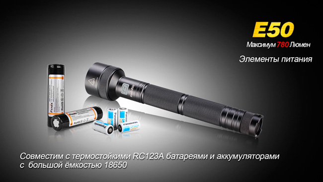 • Большой заряд. Одним из главных плюсов светодиодного LED  фонаря является то, что его можно использовать как с одним, так и с двумя аккумуляторами 18650. В результате на минимальной мощности в 23 люмена (этого хватит, чтобы освещать предметы вблизи) он проработает целых 80 часов! Таким образом, Вы можете спокойно брать светодиодный аккумуляторный фонарь Феникс E50 даже в долгие походы – Вам не придётся думать, где бы перезарядить аккумуляторы. Помимо этого, фонарик совместим с термостойкими батарейками RC123A.