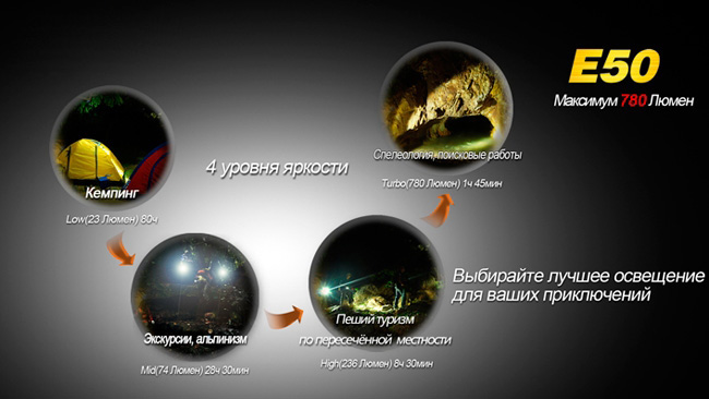 • Мощность. Максимальная мощность светодиодного фонарика E50 составляет 780 люменов. На практике это означает, что на максимуме фонарь может освещать предметы на расстоянии до 260 метров. Для туристического фонаря такого класса это просто великолепное значение. При желании можно выбрать три других режима — на 236, 74 и 23 люмена.