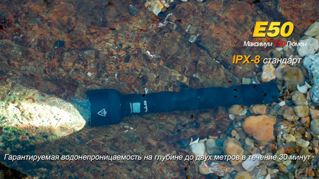 • Надёжность. Ресурс диода CREE XM-L T6  составляет фантастические 50 000 часов (около 5 лет работы). А противоударный корпус фонарика изготовлен из анодированного авиационного алюминия. Свет проходит через сверхпрочное закалённое стекло, также нечувствительное к ударам и устойчивое к царапинам. Наконец, фонарику Fenix E 50 не страшна непогода, даже в сильный ливень Вы можете использовать его, не прикрывая ничем. Более того, если водонепроницаемый фонарь упадёт в воду (глубиной до 2 метров), с ним ничего не случится.