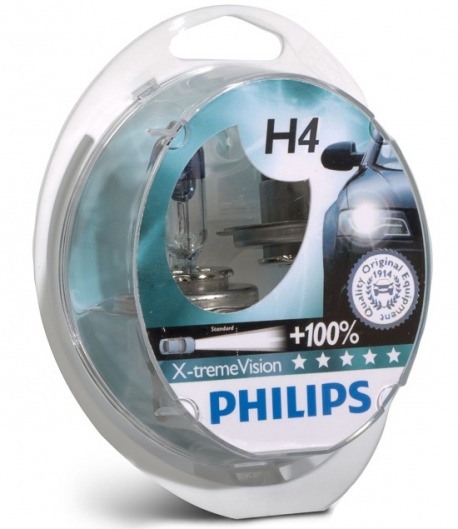 Галогеновая лампа Philips H4-X-treme VISION (с цоколем Н4) дает на 100 % больше света, чем обычная лампа. При этом автомобильная лампа изготовлена из высокопрочного кварцевого стекла, что делает ее самой долговечной среди ламп с увеличенным световым потоком.