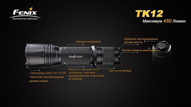 Для комфортного использования ТК12 в качестве тактического фонаря модель сделана совместимой с полным спектром аксессуаров — световых фильтров, выносной тактической кнопки, креплений под ствол. Небольшие размеры, высокая прочность и надёжность, агрессивный дизайн также делают фонарь одним из лучших в нише подствольных тактических фонарей.