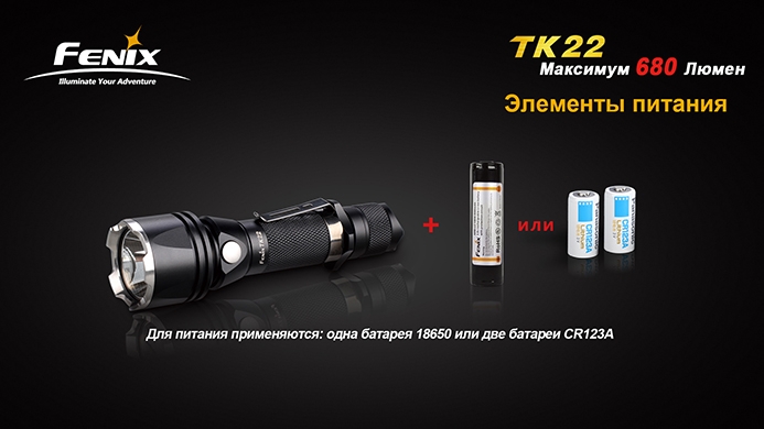 Питается подствольный фонарь Fenix TK22 от 1 аккумулятора 18650 либо от 2 аккумуляторов CR123. Рекомендуется использовать качественные элементы питания, не стоит использовать батареи от разных производителей либо с разным уровнем заряда. Батарейный блок имеет усовершенствованную конструкцию с двойной пружиной — контакты элементов питания не отходят даже при сильных ударах.