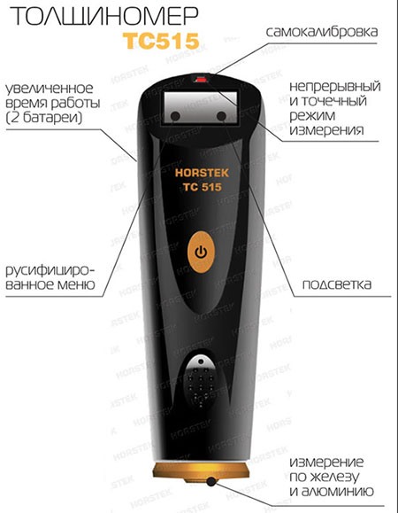 Автомобильный толщиномер Horstek TC 515 отличается современным дизайном, который выполнен с учетом всех требований эргономики. А это значит, что пользоваться данным устройством очень удобно и легко. Более того, толщиномер покрытий автомобиля Horstek TC 515 обладает многофункциональным русифицированным меню. Все это очень важно, т.к. в условиях работы с толщиномером обычно нужно быстро и без усилий определить толщину лакокрасочного покрытия. Поверьте, толщиномер Horstek TC 515 – это как раз то, что нужно!
