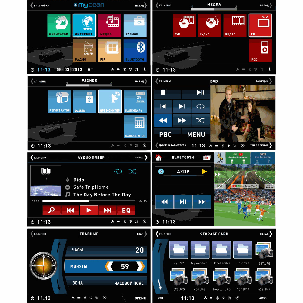 Штатная голова сделана на базе двухъядерного процессора A8 семейства ARM Cortex с очень высокой производительностью. На ШГУ MyDean 1020-2 устанавливается операционная система WinCE 6.0 с полностью русифицированным меню. Сенсорный дисплей диагональю 7 дюймов, с разрешением 800х480 и высокой контрастностью позволяет отлично просматривать фото и видео всех основных форматов, включая видео высокой чёткости HD. Также Вы можете просматривать эфирное телевидение, для этого в штатную голову встроен аналоговый ТВ-тюнер.