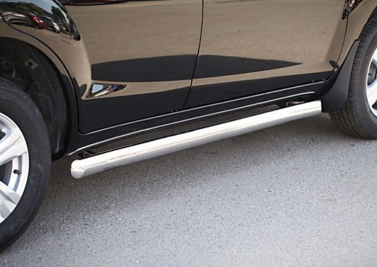 Пороги на Lifan X60 – это боковые подножки в виде овальной трубы из нержавеющей стали диаметром 75х42 мм, которые позволяют более комфортно входить и выходить из салона автомобиля. Подножки Lifan X60 очень прочные, надежные и долговечные: они не боятся коррозии, сколов и царапин и выдерживают большие нагрузки.