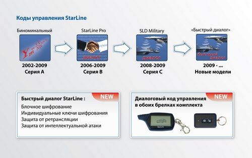 StarLine В6 Dialog надежно защищена от электронного взлома диалоговым кодом радиоуправления «Быстрый диалог». Это код управления с индивидуальными ключами шифрования, котоорый исключает интеллектуальный взлом и устойчив ко всем кодграбберам. Для защиты кода используется наиболее совершенный на данном этапе алгоритм диалогового кода и инновационный метод прыгающих частот. По этому методу во время передачи команд частоты меняются в периоде каждой посылки.