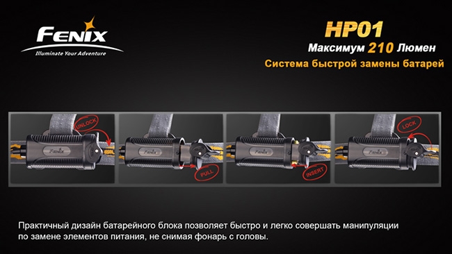 LED налобный фонарь Fenix HP01 питается од 2 батарей AA (пальчик). В фонарике реализована система быстрой замены элементов питания – Вы можете легко вынуть батарейки и вставить новые, даже не снимая светодиодный фонарь с головы.