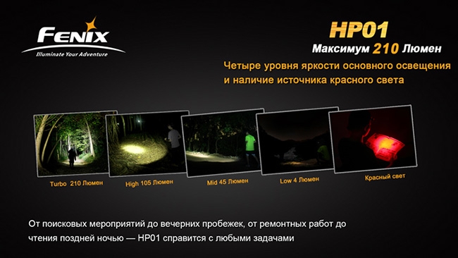 Мощный налобный фонарь FenixHP01 благодаря отличной оптике и современному диоду Cree выдаёт луч до 210 люмен на расстояние до 102 метров. Всего же у яркого налобного фонаря 4 основных режима яркости, не считая мигания: