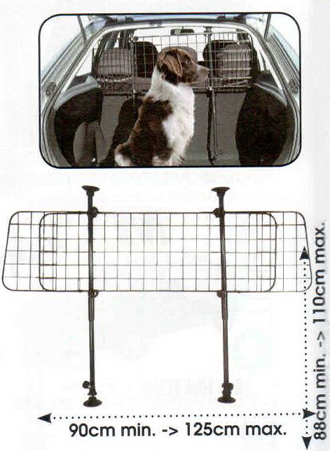 Главное преимущство металлической решетки — она состоит из центрального элемента и 2-х боковых накладок. Благодаря этому можно регулировать ширину решетки от 90 до 125 см. Высота самой решетки — 30 см. Металлическая сетка крепится на стойки — распорки между крышей и полом. Стойки оснащены резиновыми заглушками для того, чтобы не повредить обшивку потолка и пола. Кстати, металлические стойки также регулируются по высоте (от 88 до 110 см). Таким образом, разделительная сетка для животных подойдет для любого размера багажника.