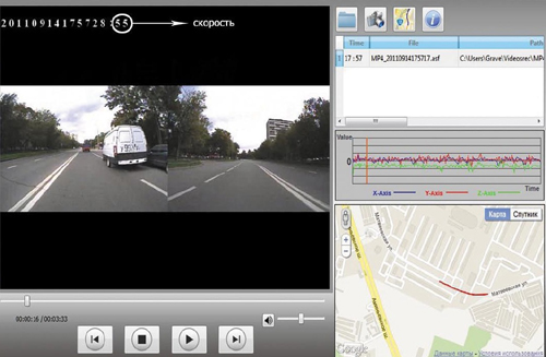 Встроенный GPS-модуль. Благодаря такому датчику вы можете подробнейшим образом фиксировать пройденный путь своего мотоцикла, снегохода или автомобиля. Кроме того, благодаря специальному программному обеспечению, которое входит в комплект, у вас есть возможность видеть прямо в одном окне изображение с 2-ух камер, путь (на карте), действующие перегрузки, а также текущие скорость и время. Все это позволяет вам зафиксировать абсолютно всю поездку — вплоть до мелочей.