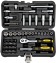 В комплект набора инструментов входят следующие предметы: торцевые головки разных размеров, ключ трещоточный с 45-ю зубьями, Т-образный вороток, отвертка с присоединительным квадратом, удлинители, шарнирный кардан, биты различного вида, адаптер для бит и шуруповерта. Полную комплектацию со всем размерным рядом вы можете посмотреть в «Характеристиках», во вкладке справа.