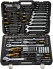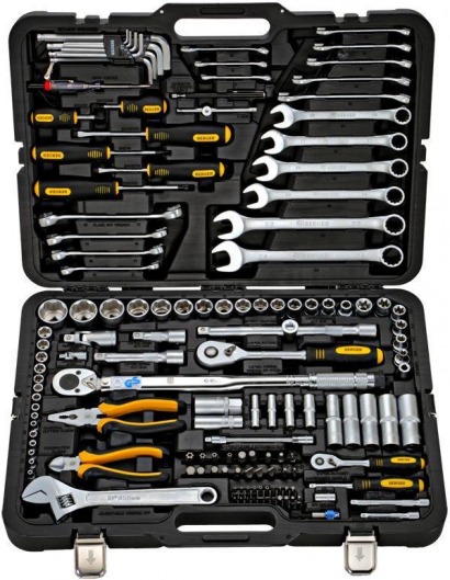 В комплект входит следующее: комбинированные, шестигранные и разводные ключи, бокорезы, пассатижи, автотестер, динамометрический ключ, большой размерный ряд бит, трещоточный ключ, торцевые и свечные головки, ключи разрезные-прокачные, а также многое другое. Всю комплектацию вы можете посмотреть в «Характеристиках», во вкладке справа.