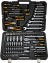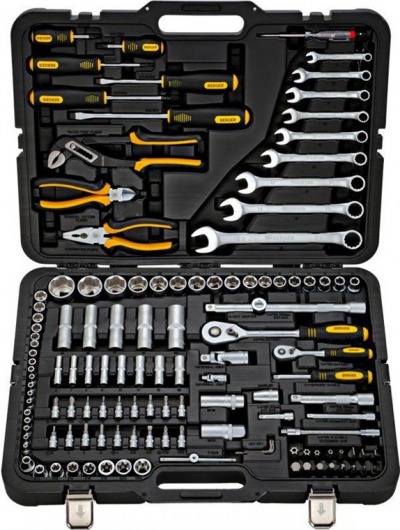 Набор инструментов-предметов содержит следующее оборудование: ключ гаечный накидной 6-гранный, переставные клещи, комбинированные ключи разного размера, шарнирный и Т-образный вороток, ключ-трещотку с 45-ю зубьями, торцевые и свечные головки, различные биты и многое-многое другое. Всю подробную комплектацию вы можете посмотреть в «Характеристиках», во вкладке справа.