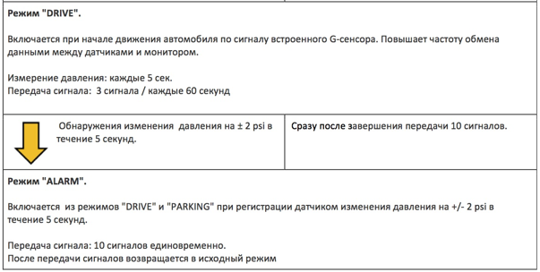 Датчик постоянно передает показатели давления и температуры на небольшой дисплей, который вы устанавливаете в любое удобное место в салоне автомобиля. Дисплей отображает данные в виде четырех цифр, которые располагаются соответственно колесам. Когда давление и температура одного из колес выходят за установленные вами пределы, система предупреждает вас звуковым и цветовым сигналами.