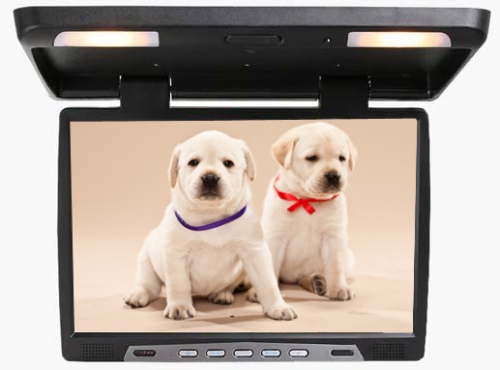 Потолочный монитор с большим размером диагонали прекрасно подойдет для установки в джипы и минивены. Корпус монитора выполнен из качественного пластика черного цвета, замечательно вписывается в интерьер автомобиля.
