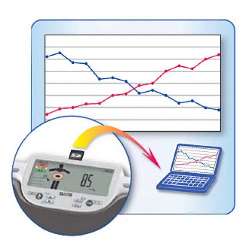 Анализатор состава тела Tanita BC-601 рассчитан на 4-х пользователей, для каждого из которых создается персональный профайл. При этом все показания устройство автоматически сохраняет на карту памяти SD, которую вы получите в комплекте. Все данные можно загрузить на компьютер и управлять ими с помощью специальной программы “Bodyvision” (программа).