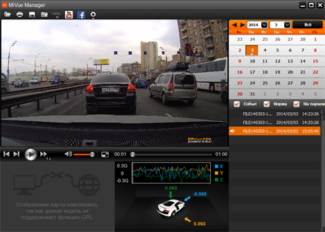 • MiVue Manager — программа для просмотра и управления данными. С ней удобно не только просматривать видео, но и делиться видеороликами в соцсетях и даже наблюдать за направлением движения автомобиля во время экстренных ситуаций.