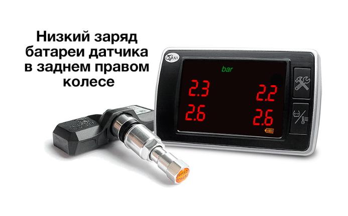• Оповещение звуковым и световым сигналами. Когда давление и температура одного из колес выходит за установленные вами пределы, система предупреждает вас звуковым сигналом, а также подсвечивает цифру проблемного колеса на экране.