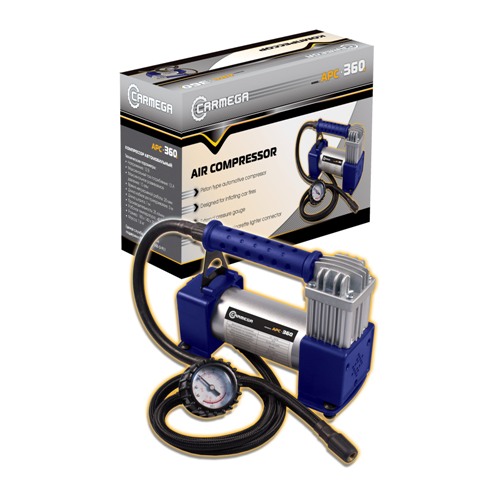 Поршневой компрессор Carmega APC-360 обладая высокой производительностью, скромными размерами и весом всегда выручит вас  в случае прокола шины и поможет поддерживать правильное давление в шинах. Давления в 10 атмосфер при производительности 25 л/мин. с избытком хватает для накачивания шин любых легковых типов и размеров, в том числе используемых на кроссоверах.