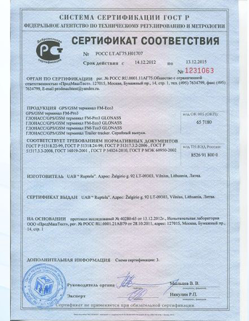 Устройство полностью соответствует приказу Минтранса РФ № 285 "Об утверждении требований к средствам навигации, функционирующим с использованием навигационных сигналов системы ГЛОНАСС или ГЛОНАСС/GPS и предназначенным для обязательного оснащения транспортных средств категории М, используемых для коммерческих перевозок пассажиров, и категории N, используемых для перевозки опасных грузов".