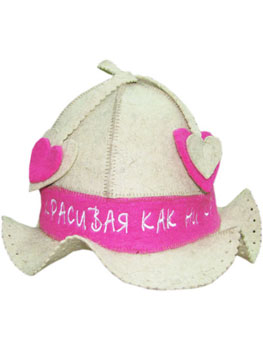 Шапка для бани "Красивая как ни крути" - не только колоритный акссесуар для любой банщицы, но и полезная вещь в парной. Банная шапка выполнена из войлока в дизайне кокетливой шляпки и не только убережет вашу голову и волосы от пагубного воздействия горячего воздуха в парной, но и подчеркнет ваше чувство стиля, добавит вашему образу изысканности и утонченности.