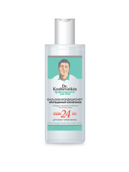 Бальзам-кондиционер Dr. Kozhevatkin для всех типов волос, обогащенный коллагеном, усиливает действие шампуня. Создает невидимую защитную коллагеновую пленку по всей длине волос. Укрепляет волосы и возвращает упругость, силу и здоровый блеск. Способствует снятию электростатического заряда с поверхности волос, улучшает послушность, придает мягкость.
