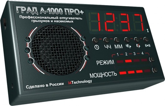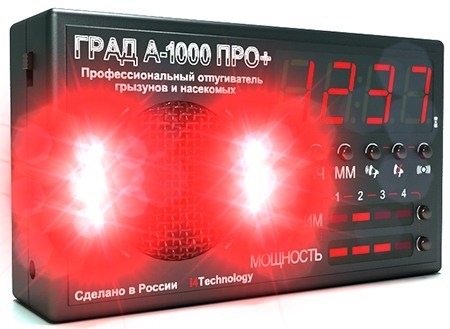 Универсальный отпугиватель грызунов и кротов ГРАД А-1000 ПРО+ — это усовершенствованная модель А-1000 ПРО  и не имеет аналогов в мире! Помимо всех выполняемых функций, сохранившихся от А-1000 ПРО, устройство оснащено часами и таймером для работы прибора в автоматическом режиме. Данная модель способна защитить огромную площадь — до 1000 м2 от любых вредителей, поддерживает бесшумный режим и регулировку мощности излучения. Воздействие на грызунов происходит 3-мя способами: звук, вспышки светодиодного стробоскопа и ультразвук. Особый изменяющийся "рисунок" звукового сигнала не дает грызунам адаптироваться к работе устройства.