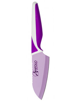 Нож Apollo "Nuances" изготовлен из высококачественной нержавеющей стали со специальным антибактериальным покрытием лезвия. Специальное нестираемое антибактериальное покрытие препятствует контакту продукта и стали, значительно увеличивает гигиенические свойства ножа. Эргономичная рукоятка выполнена из высококачественного пищевого прорезиненного пластика бело-фиолетового цвета. Рукоятка не скользит в руках и делает резку удобной и безопасной.