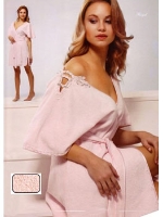 Изысканный кружевной халатик из нежной и легкой махровой бамбуковой ткани. Необычная обработка плеча халата кружевами - плечо слегка приспущено, открыто и закреплено изобилием кружевных элементов. Так же отделка кружевом правой полы халата и по нижнему краю рукавов. Рукав широкий 3/3-и в стиле кимоно. Модель укороченная, чуть выше колена. Атласная окантовка по всем краям халата.
