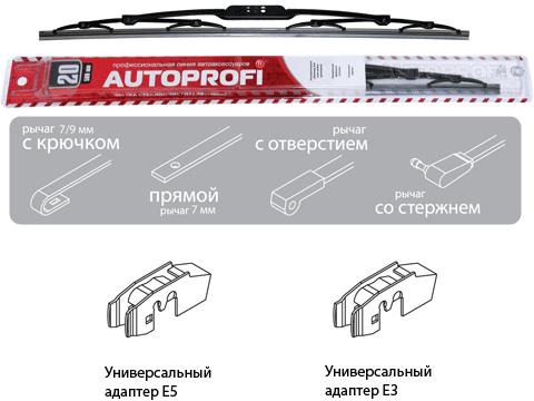 Щетки стеклоочистителя Автопрофи AD - универсальные щетки стеклоочистителя, подходящие на все времена года. Использован специально разработанный состав резины с добавлением   политетрафлуороэтилена. Высокая степень гибкости, маленькое трение. Большой срок службы. В комплекте три адаптера.