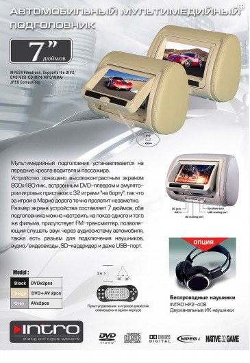 Универсальный подголовник с монитором 7" INCAR CDH-72 выполнен в бежевом цвете и установливается на спинку переднего сиденья абсолютно любого автомобиля.  В данной модели есть встроенный DVD-проигрыватель и эмулятор игровых приставок с 32 играми.