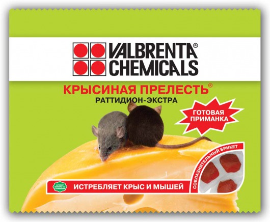 Готовая приманка для крыс VALBRENTA CHEMICALS РАТТИДИОН-Экстра с удобной дозировкой — это доступное и надежное средство для борьбы с крысами в любых местах обитания. Аппетитные мягкие брикеты с ароматом ванили со сливками учитывают пищевые предпочтения крупных грызунов, так что ни одна крыса не устоит перед таким "угощением". При этом достаточно совсем маленькой дозы, чтобы отравляющие вещества начали действовать.