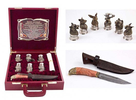 Подарочный набор из стопок-перевертышей и охотничьего ножа поможет выразить ваше уважение к другу, родственнику или коллеге. Личные стопки с именной надписью и настоящий дамасский нож — знак успешности и престижа, который придется по душе любому охотнику.