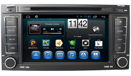 Штатное головное мультимедийное устройство позволяет прослушивать аудиофайлы различных форматов, просматривать видео (в том числе в HD-формате) и фотографии как с внутренней памяти устройства (8 Гб), так и с внешних носителей и  SD карт памяти. Вы также можете слушать аналоговое или интернет-радио или смотреть видео онлайн. Или подключить цифровой ТВ-тюнер, чтобы смотреть цифровые каналы прямо на экране устройства. А еще у вас есть возможность подключить DVD-привод и смотреть фильмы и управлять DVD-меню прямо с сенсорного экрана магнитолы.